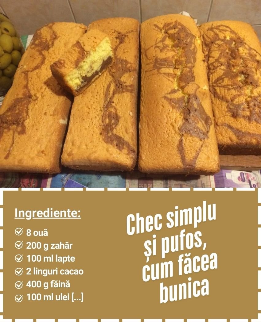 Descriere Acest chec se prepară ușor, din ingrediente obișnuite, fără niciun strat separat de aluat. Rezultatul: un blat moale, aromat și savuros, ideal pentru ceai sau desert rapid. Ingrediente (formă chec 22–24 cm) 3 ouă mari 180 g zahăr 120 ml ulei (sau 100 g unt topit, răcit) 120 ml iaurt sau lapte 1 linguriță … Read more