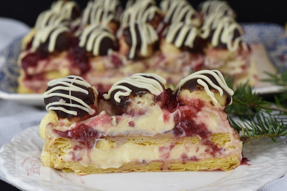 Mille‑feuille cu profiterol și sos de căpșuni