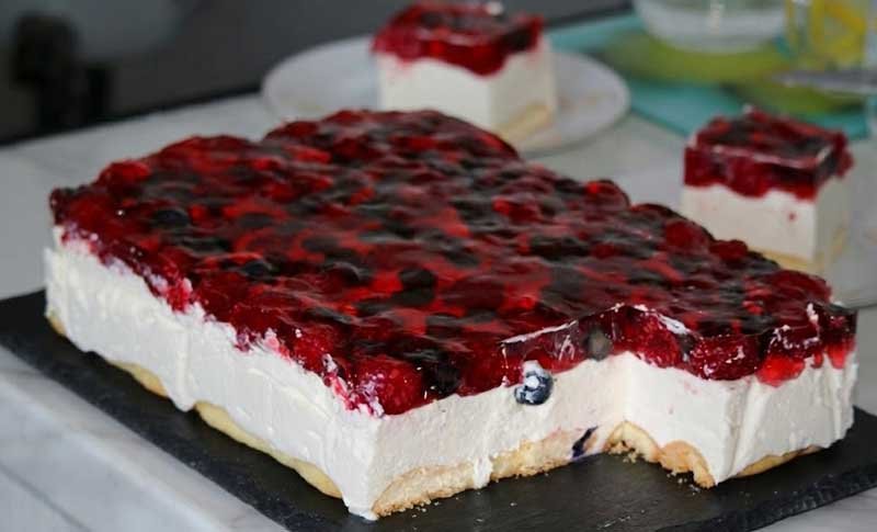 Biscuiții frageziți, crema aerată și fructele proaspete, acoperite cu un strat de jeleu, se combină perfect într-un desert spectaculos și răcoritor. Ideal pentru zile călduroase sau când vrei ceva dulce, dar lejer.