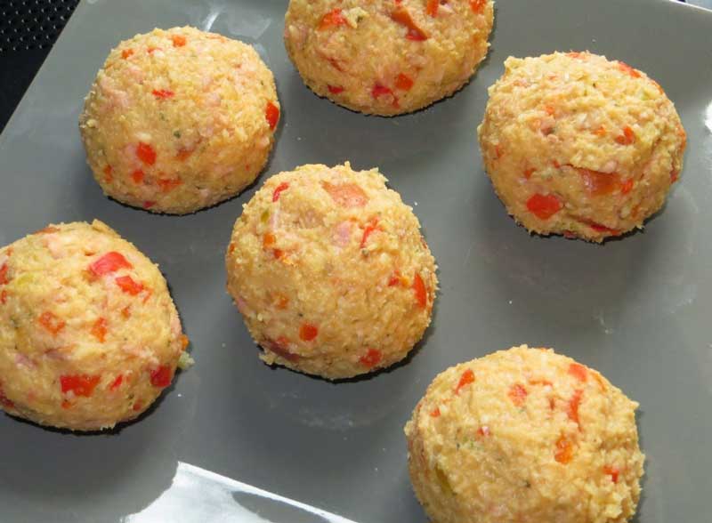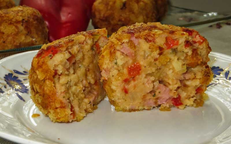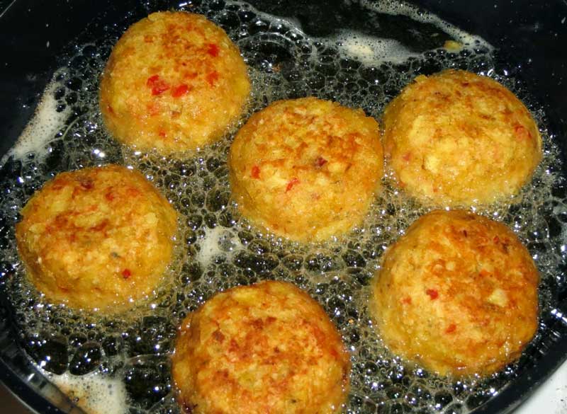 Se condimentează după gust cu sare, chili, măghiran și piper. Se adaugă un ou și se frământă cu mâna. Se formează chifteluțe (ies aproximativ 6 bucăți). Ouăle se bat. Chipsurile se zdrobesc.