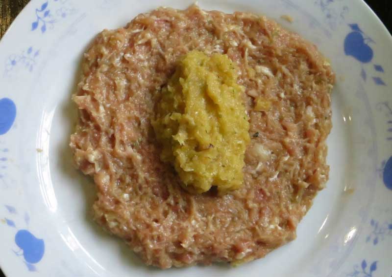 Modelăm chifteaua sub formă de cilindru (ca un cartof umplut), închizând bine marginile.