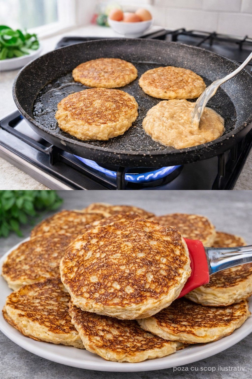 • Gătește 2–3 minute pe fiecare parte, până devin aurii și apar bule la suprafață.