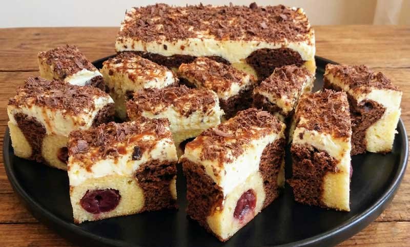 Coaja de lămâie din umplutură și vișinele din compot dau o prospețime aparte, în timp ce frișca și budinca transformă desertul într-un răsfăț fin. Este genul de prăjitură care arată spectaculos la tăiere și se termină rapid din tavă.