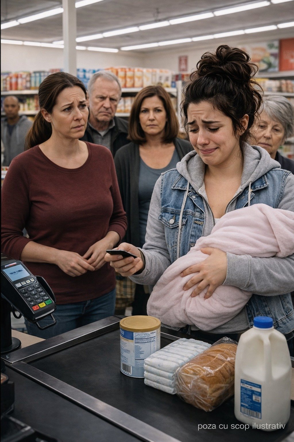 În această coadă stătea o femeie cu un bebeluș în brațe. Copilul era învelit într-o pătură, iar ea îl ținea strâns la piept, de parcă se temea să se miște prea mult. În coșul ei aproape că nu erau alimente obișnuite. Erau scutece, lapte praf, șervețele și doar o pâine — pentru ea.