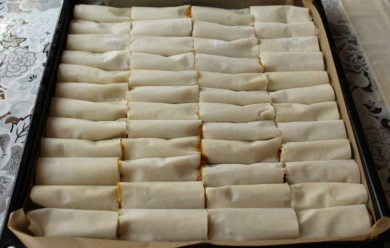 6. Le rulăm. Procedăm la fel până terminăm foile, pe care le punem într-o tavă dreptunghiulară, tapetată cu hârtie de copt.