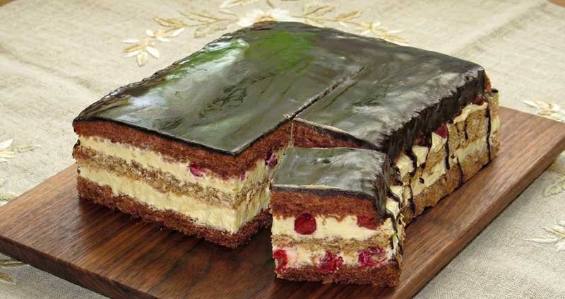 Această prăjitură este un exemplu de echilibru între textură și aromă, combinând trei blaturi delicioase: două cu cacao, unul cu nucă măcinată, toate alternate cu o cremă fină de vanilie și vișine acrișoare. Fiecare strat aduce un contrast plăcut, iar glazura de ciocolată de deasupra încununează desertul cu o notă elegantă.