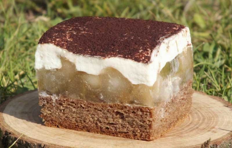 Această prăjitură cu blat de cacao, jeleu de pere și cremă de frișcă cu mascarpone este un desert echilibrat, rafinat și spectaculos – ideal pentru zile speciale sau când vrei să impresionezi. Blatul moale și ușor însiropat, jeleul fructat și crema delicată formează un trio de texturi care se completează perfect. Perele adaugă prospețime și dulceață naturală, iar decorul cu cacao îi oferă un aer elegant.