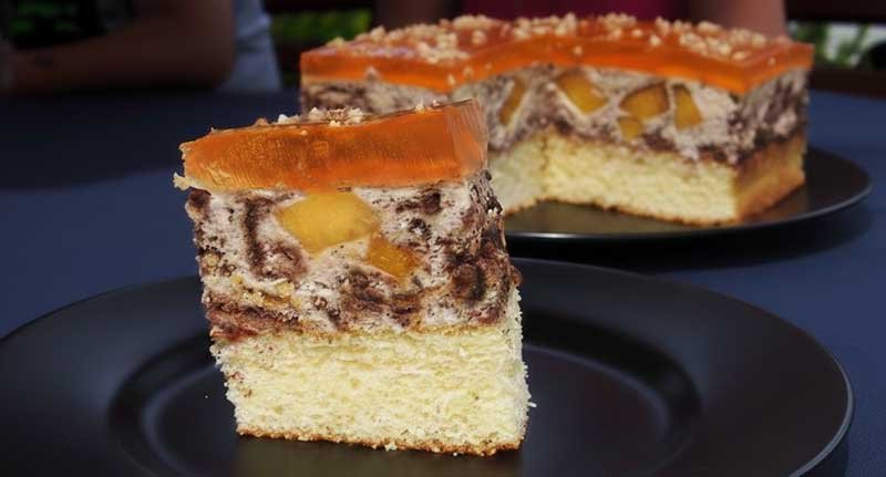 Această prăjitură cu frișcă, piersici și napolitane este o combinație irezistibilă de gusturi și texturi. Blatul pufos de pandișpan se îmbină armonios cu o cremă aerată și fructată, iar stratul final de jeleu oferă un aspect elegant și o notă răcoritoare.