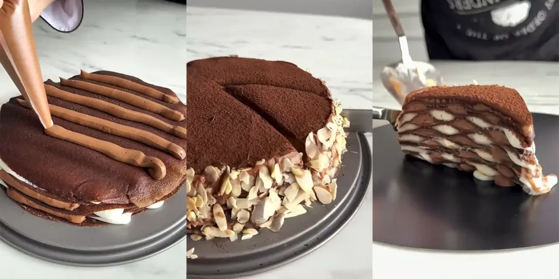 Un desert spectaculos cu straturi fine de clătite și două creme mătăsoase — una cu ciocolată albă, alta cu ciocolată amăruie. Textură perfectă, gust rafinat și echilibru delicios între dulce și cacao.