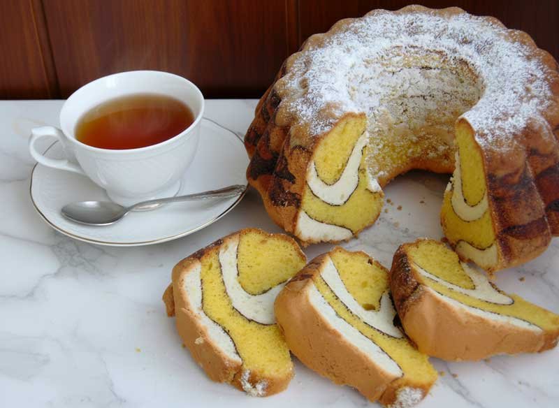O rețetă simplă, dar spectaculoasă: două aluaturi colorate natural (cu gălbenuș și albuș), alternate în straturi fine, presărate cu cacao, care la copt creează un model mozaicat minunat. Prăjitura este pufoasă, ușor umedă, cu gust delicat de vanilie și poate fi aromatizată cu coajă de portocală sau lămâie pentru un plus de prospețime.