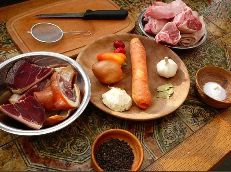 1. Începem cu carnea afumată, așezând-o pe fundul unei oale mari, apoi adăugăm pielea, morcovul curățat și tăiat pe jumătate, ardeiul gras, ardeii iuți, ceapa, usturoiul, frunzele de dafin, țelina. Presărăm jumătate din sare și turnăm apă peste ingrediente.
