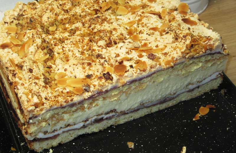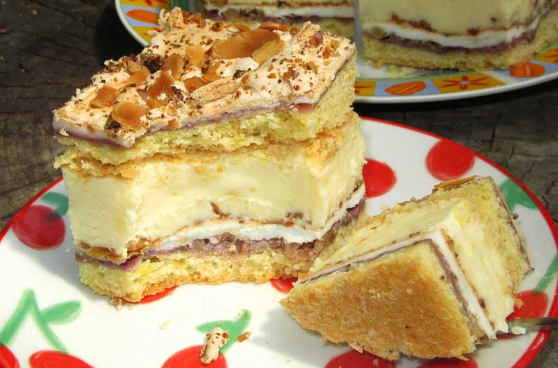 6. După ce s-au copt ambele straturi de aluat și crema s-a răcit, se pune crema peste primul strat de aluat. Apoi se adaugă al doilea strat de aluat cu bezea și se lasă la frigider pentru a se răci complet.