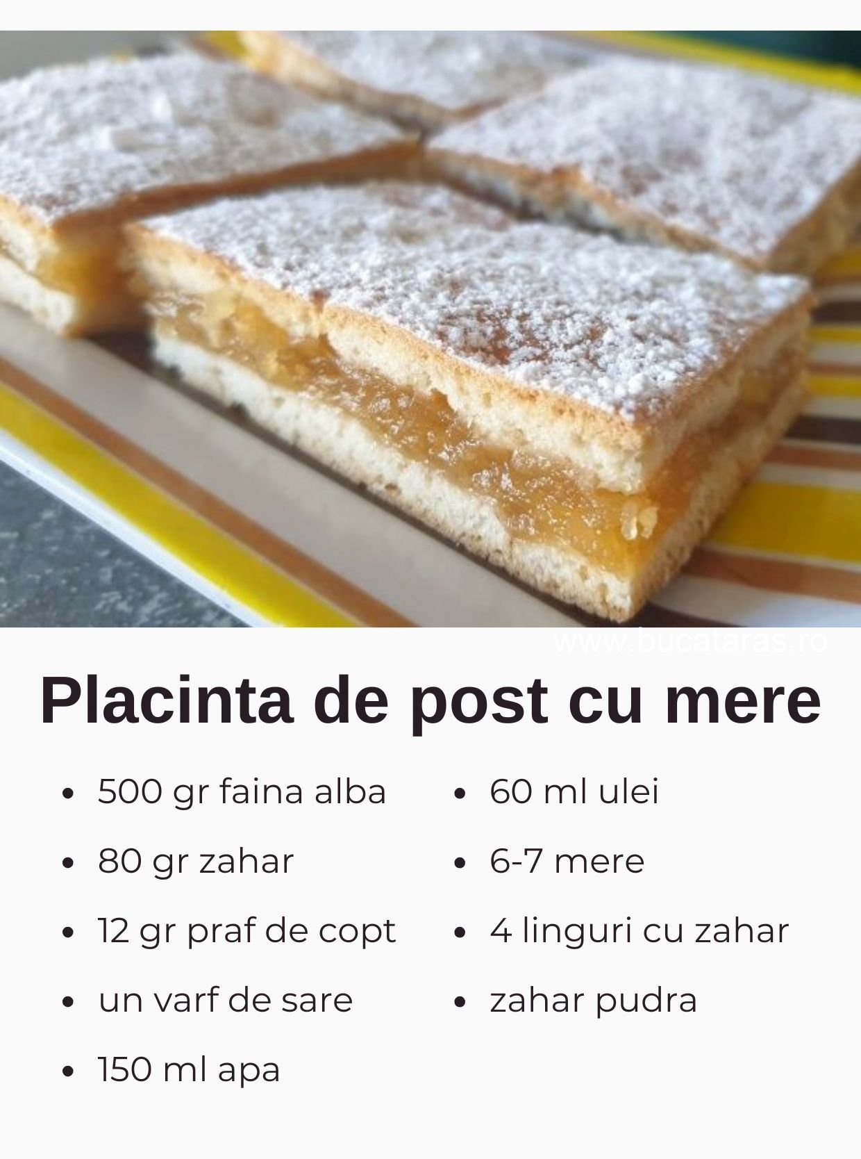 Încântă-ți papilele gustative cu aroma dulce și delicioasă a unei plăcinte de post cu mere, pregătite cu dragoste și atenție la detalii. Această rețetă simplă și de post vă puteți oferi o alternativă sănătoasă și salvată pentru deșerturile tradiționale. Bucură-te de gustul minunat al merele proaspete, îmbinate cu un blat fraged și bun, perfect pentru a fi salvat alături de cei dragi în timpul postului sau în orice moment al zilei.