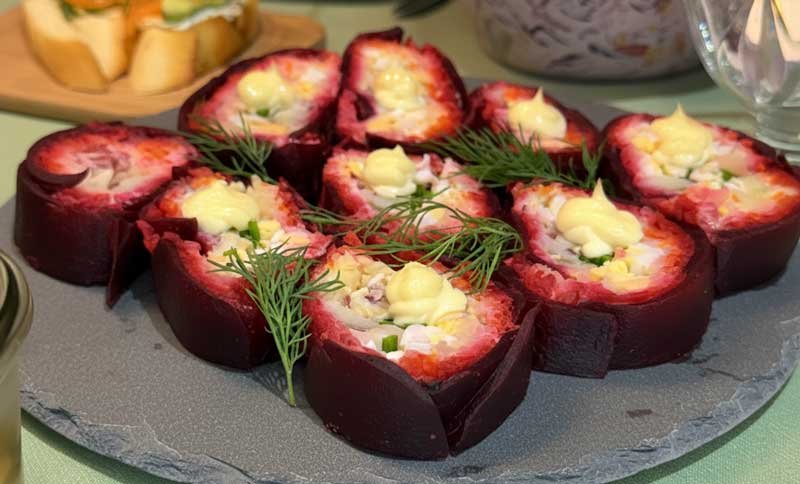 Această ruladă de sfeclă roșie cu hering este un preparat care impresionează atât prin gust, cât și prin aspect. Ideală pentru mesele festive sau când vrei să aduci ceva special la o cină în familie, rețeta îmbină legume coapte, ouă, hering și maioneză într-o armonie perfectă.
