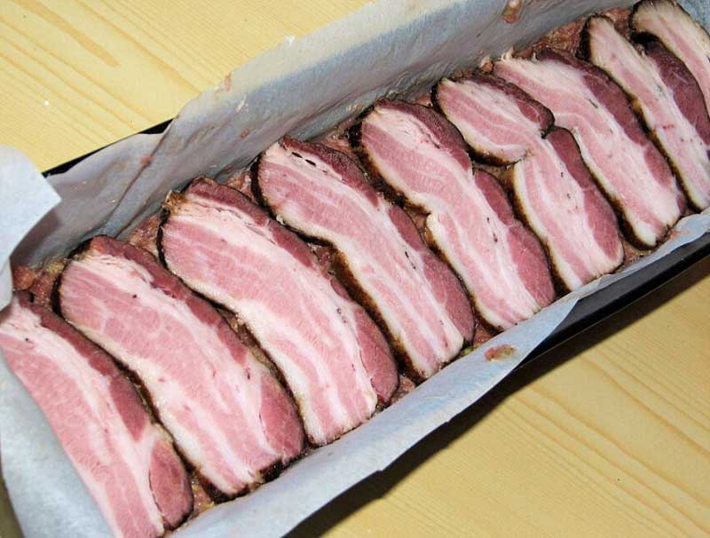3. Tapetăm o tavă lungă dreptunghiulară cu hârtie de copt. Baconul îl tăiem felii de aproximativ 5 mm.