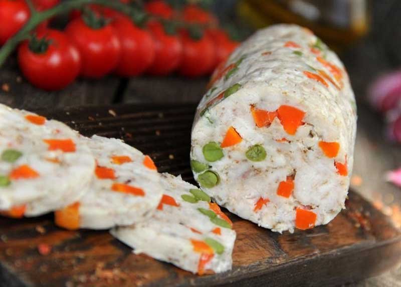 Am pregătit recent salam de casă din piept de pui cu gelatină. A ieșit foarte gustos și fraged. Am adăugat în plus și morcov și mazăre verde – au adus un plus de culoare și s-au potrivit perfect.