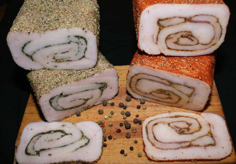 Se fierbe 3-3,5 ore la temperatura de 90 de grade. După ce am scos presa din apă, lăsăm să se răcească și o punem la frigider pentru 24 de ore. După acest timp, scoatem slănina și o presărăm cu condimente și ierburi pe deasupra. Apoi o înfășurăm din nou în folie alimentară pentru a nu se usca.