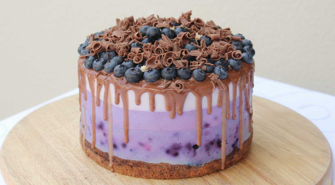 Turnăm ganache-ul peste tortul răcit și îl decorăm cu afine.