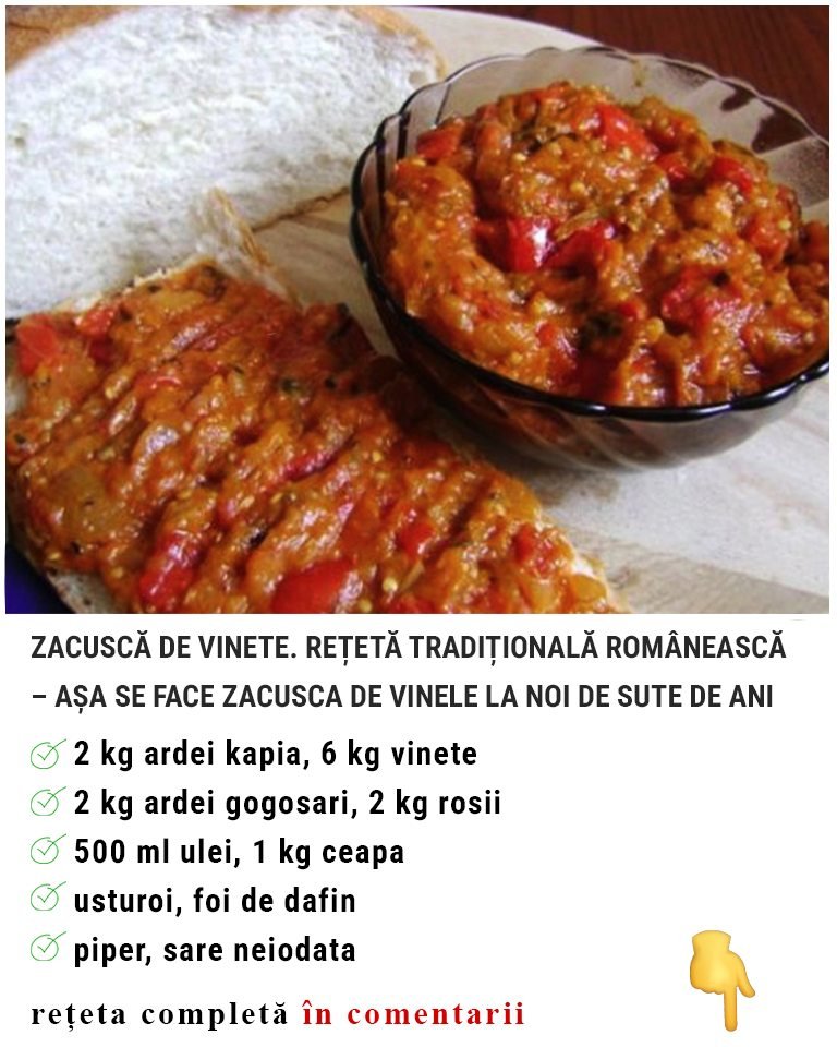 Zacusca de vinete este un preparat tradițional românesc, apreciat pentru aroma sa bogată și gustul inconfundabil. Aceasta combinație de vinete coapte, ardei, ceapă și roșii este nelipsită din cămările multor gospodării, fiind perfectă pentru iarnă. Zacusca poate fi servită pe pâine proaspătă, ca aperitiv sau garnitură la diverse feluri principale.